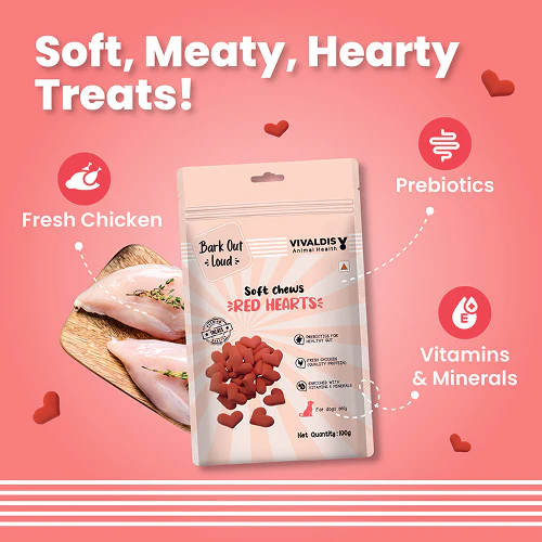Bark Out Loud by Vivaldis Red Hearts Spanish Dog Treats are premium, flavourful snacks crafted to delight your dog while providing wholesome nutrition. Made with high-quality ingredients, these heart-shaped treats are designed to be soft, chewy, and easy to enjoy for dogs of all breeds and ages.