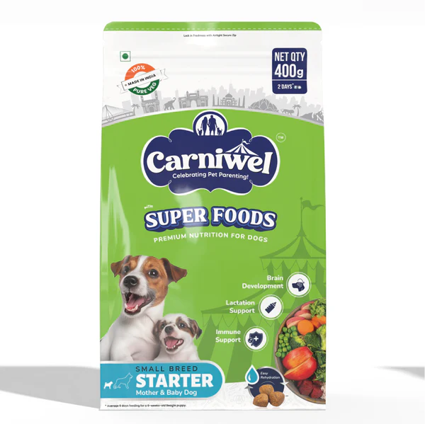Carniwel Superfoods Veg Kibble Starter for Small Breed Mother & Baby Dog Dry Food is a nutrient-dense, vegetarian formula crafted to support the specific needs of small breed mothers during pregnancy and lactation, as well as their weaning puppies. Made with a wholesome blend of superfoods like pumpkin, spinach, carrots, lentils, and sweet potato, it delivers plant-based protein, essential vitamins, and minerals to fuel growth, recovery, and immunity.