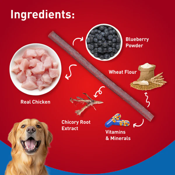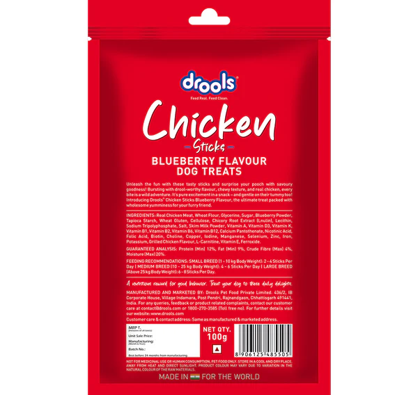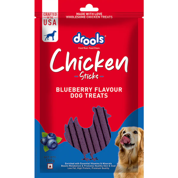 Drools Blueberry Flavour Chicken Sticks Treat for Dogs is a tasty, protein-rich snack that blends the savory goodness of real chicken with the natural sweetness of blueberry flavour. These soft and chewy sticks are crafted to be both delicious and nutritious, offering high-quality protein to support muscle development and overall health. Enriched with the antioxidant benefits of blueberries, they help promote immunity and support cellular health, making them more than just a treat. Their enticing aroma and easy-to-digest formula make them ideal for dogs of all breeds and sizes, whether used as a training reward or a daily indulgence. Free from harmful additives and artificial colours, Drools Chicken Sticks with Blueberry Flavour are a wholesome, flavourful addition to your dog’s routine that satisfies their taste buds while nourishing their body.