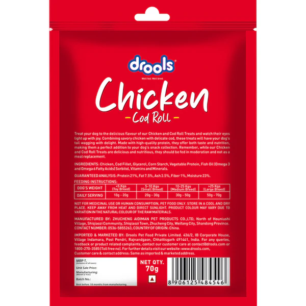 Drools Chicken Cod Roll Dog Treats are a protein-rich, flavorful snack designed to keep your dog satisfied and healthy. Made with real chicken and cod, these rolled treats deliver high-quality animal protein to support muscle development and overall vitality. The chewy texture provides a rewarding bite that helps promote dental health by reducing plaque and tartar buildup. Free from artificial colors, flavors, and harmful additives, these treats are easily digestible and suitable for dogs of all breeds and sizes. Ideal as a training reward or an occasional indulgence, Drools Chicken Cod Roll Dog Treats combine irresistible taste with wholesome nutrition, making treat time both enjoyable and beneficial for your furry companion.