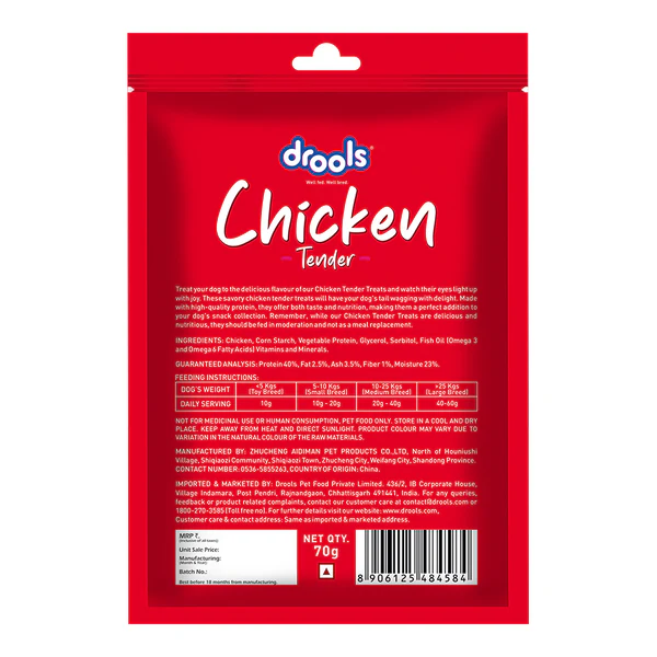 Drools Chicken Tender Dog Treats are a delicious and protein-packed snack crafted with real chicken to delight your dog while supporting overall health. These tender treats are rich in high-quality protein to help maintain strong muscles and provide sustained energy for active dogs of all breeds and sizes. Their soft, chewy texture makes them perfect for training rewards, occasional treats, or simply spoiling your furry friend. Free from artificial colors, flavors, and harmful additives, Drools Chicken Tenders are easily digestible and wholesome, offering a safe and nutritious snacking experience. Each bite delivers the natural, savory taste of real chicken, making treat time both enjoyable and beneficial for your dog’s well-being.