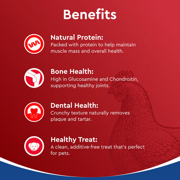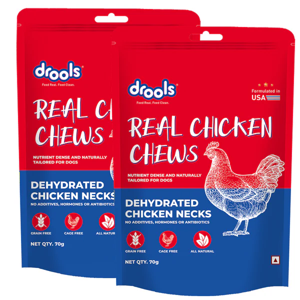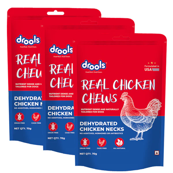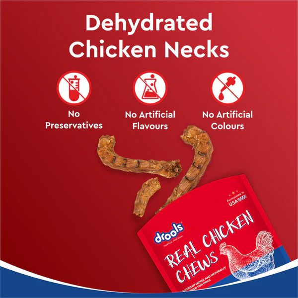 Drools Dehydrated Real Chicken Necks Chews Treat for Dogs is a natural, protein-packed chew designed to keep your dog both happy and healthy. Made from 100% real chicken necks, these dehydrated treats are rich in essential nutrients like calcium and phosphorus, which help support strong bones and teeth. The chewy texture promotes dental health by naturally reducing plaque and tartar as your dog gnaws, making it a tasty alternative to synthetic dental chews. Free from artificial preservatives, colors, or additives, this single-ingredient treat is easily digestible and suitable for dogs of all breeds. Whether used for training, rewarding, or simply as a wholesome chew, Drools Chicken Necks offer a crunchy, flavorful experience that satisfies your dog’s instinct to chew while nourishing them from the inside out.