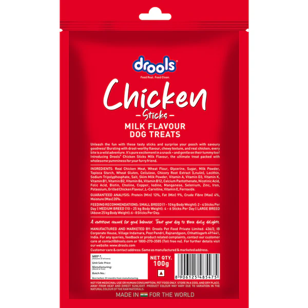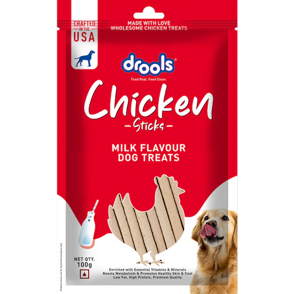 Drools Milk Flavour Chicken Sticks Treat for Dogs is a deliciously soft and chewy snack that blends the rich taste of real chicken with the creamy goodness of milk flavour. Packed with high-quality protein, these treats support muscle strength and energy levels, while the added milk flavour offers a unique twist your dog will love. Ideal for training, rewarding, or simply treating your furry friend, each stick is easy to digest and suitable for dogs of all breeds and sizes. Fortified with essential nutrients and free from artificial colours and harmful additives, these flavourful sticks promote overall well-being while satisfying your dog’s natural craving for meat. Drools Milk Flavour Chicken Sticks make treat time both nutritious and exciting, one delicious bite at a time.