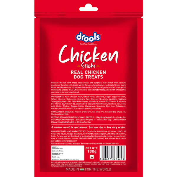 Drools Real Chicken Flavour Sticks Treat for Dogs is a protein-packed, irresistibly tasty snack made to delight dogs of all breeds and sizes. Infused with the rich, savoury flavour of real chicken, these soft and chewy sticks provide high-quality animal protein to support strong muscles and overall well-being. Their enticing aroma and tender texture make them perfect for use as training rewards or everyday treats, keeping your dog motivated and satisfied. Easily digestible and free from harmful additives or artificial colours, these treats are a safe, wholesome way to add variety to your pet’s routine. Whether you’re reinforcing good behaviour or simply showing some love, Drools Real Chicken Flavour Sticks deliver a flavourful bite your dog will crave and nutrition you can trust.