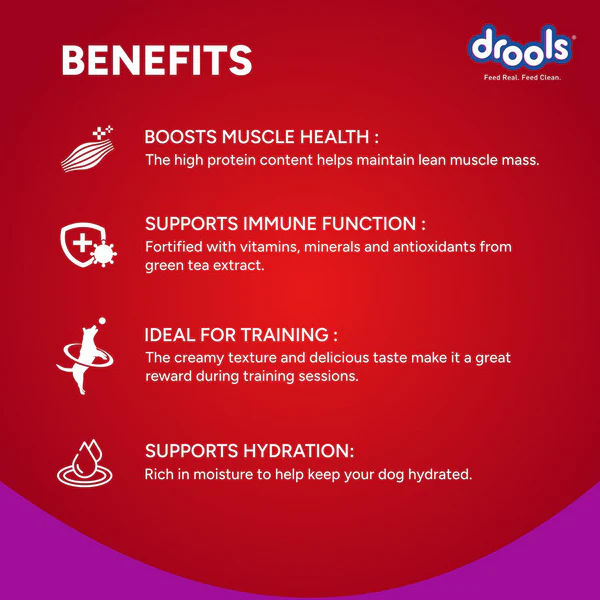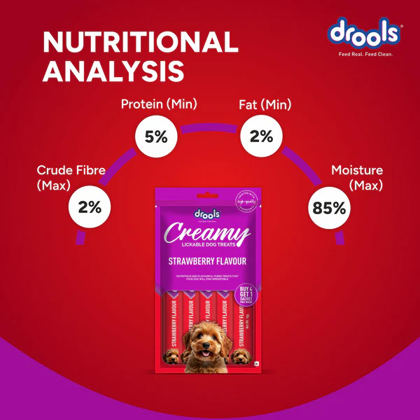 Drools Strawberry Creamy Dog Treats are a smooth, fruity delight crafted to pamper your dog with both taste and nutrition. Infused with the sweet flavour of strawberries and enriched with essential nutrients, these creamy treats are perfect for dogs of all breeds and sizes. Strawberries are naturally rich in antioxidants, vitamin C, and fiber—supporting immune health, digestion, and skin vitality. The soft, lickable texture makes them ideal for fussy eaters, senior dogs, or as a reward during training. Free from artificial colours and harmful additives, these treats are gentle on the tummy and easy to digest. Whether served straight from the tube, as a tasty topper on regular meals, or frozen for a cool snack, Drools Strawberry Creamy Dog Treats offer a delicious, wholesome way to treat your furry friend.
