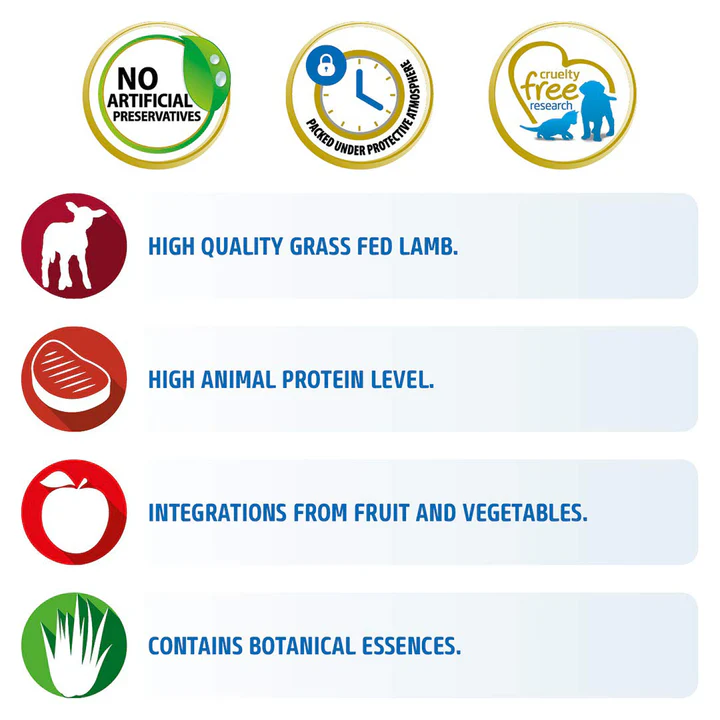 Grain-free and free from artificial additives, this food utilizes sweet potatoes, dried fruits, and vegetables such as carrots, spinach, and pomegranate to supply essential vitamins, fiber, and energy without cereals. The addition of chicken fat, herring oil, and prebiotics ensures balanced nutrition for healthy skin, digestion, and energy.