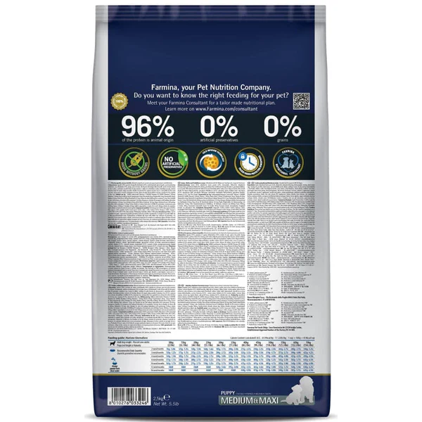 Farmina’s N&D Pumpkin Lamb & Blueberry Puppy formula is made in Italy with premium, regionally sourced ingredients. It delivers 96% protein from animal sources, including fresh lamb, dehydrated lamb protein, herring, and eggs, to promote lean muscle growth and energetic development. This recipe is tailored for medium and maxi breed puppies, with a precise calcium-phosphorus balance and joint-support nutrients such as glucosamine and chondroitin to support rapid skeletal growth without strain. Pumpkin provides gentle, soluble fiber to promote digestive ease, regulate stools, and support gut health. Blueberries and botanical extracts (turmeric, rosemary, aloe vera, green tea, apple, orange) offer antioxidant protection and help immune resilience.