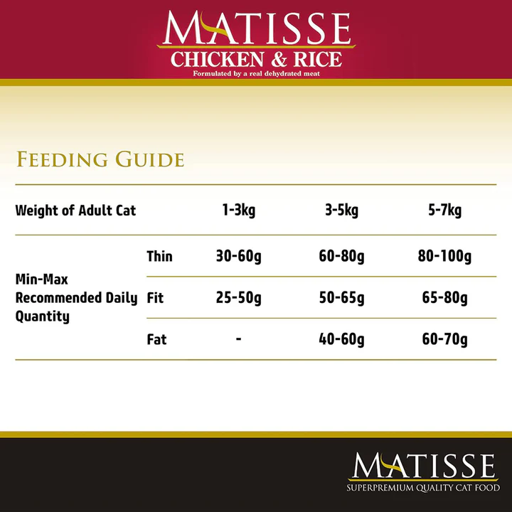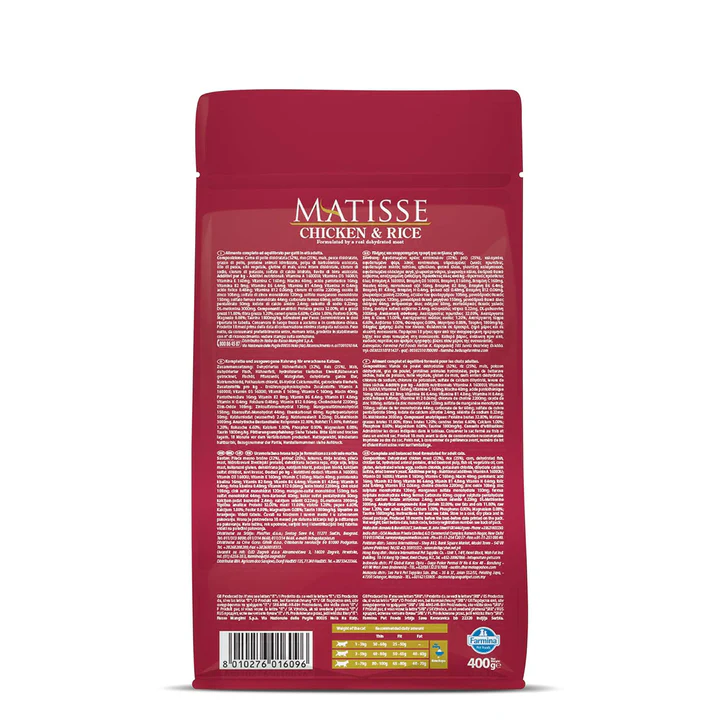 Matisse Chicken & Rice Dry Cat Food provides a complete and balanced premium diet tailored for adult cats. It features 32% dehydrated chicken protein and 25% rice to deliver highly digestible protein and energy. This formula also includes dehydrated fish protein, chicken fat, and fish oil, supplying rich sources of protein and beneficial fats for overall health.