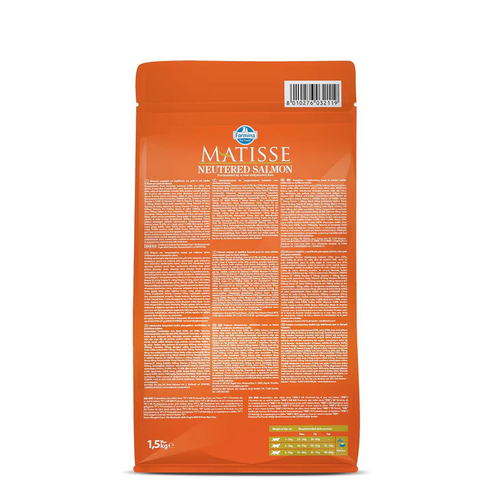 Matisse Neutered Salmon Adult Dry Cat Food offers a complete and balanced diet specifically formulated for neutered adult cats. It features 32% dehydrated salmon protein as the main ingredient, providing high-quality protein essential for maintaining lean muscle mass. The presence of taurine supports healthy eyes, brain, heart, and nerve functions.