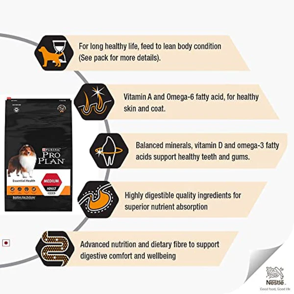 Developed by a team of over 500 veterinarians and nutritionists, Purina Pro Plan Medium Breed Adult uses quality protein sources like dehydrated chicken and chicken meal, combined with rice, whole grains, and fish oil for digestibility and nutrient efficacy. The formula includes glucosamine for joint support, live probiotics for gut health, and Omega fatty acids for skin and coat wellness
