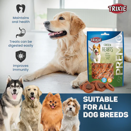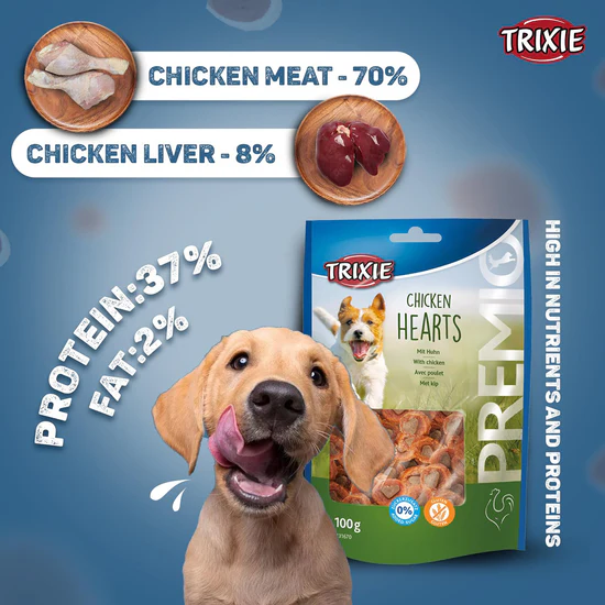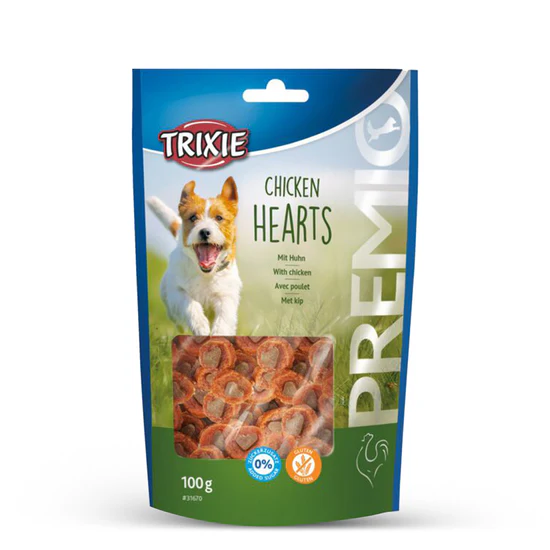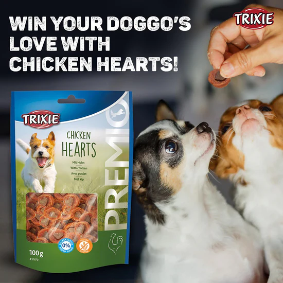 Trixie Premio Chicken Hearts Dog Treats are a premium, protein-rich snack made from real chicken hearts, designed to delight your dog while supporting their overall health. Packed with high-quality animal protein and essential nutrients, these treats help maintain strong muscles, energy, and vitality, making them ideal for dogs of all breeds and life stages.